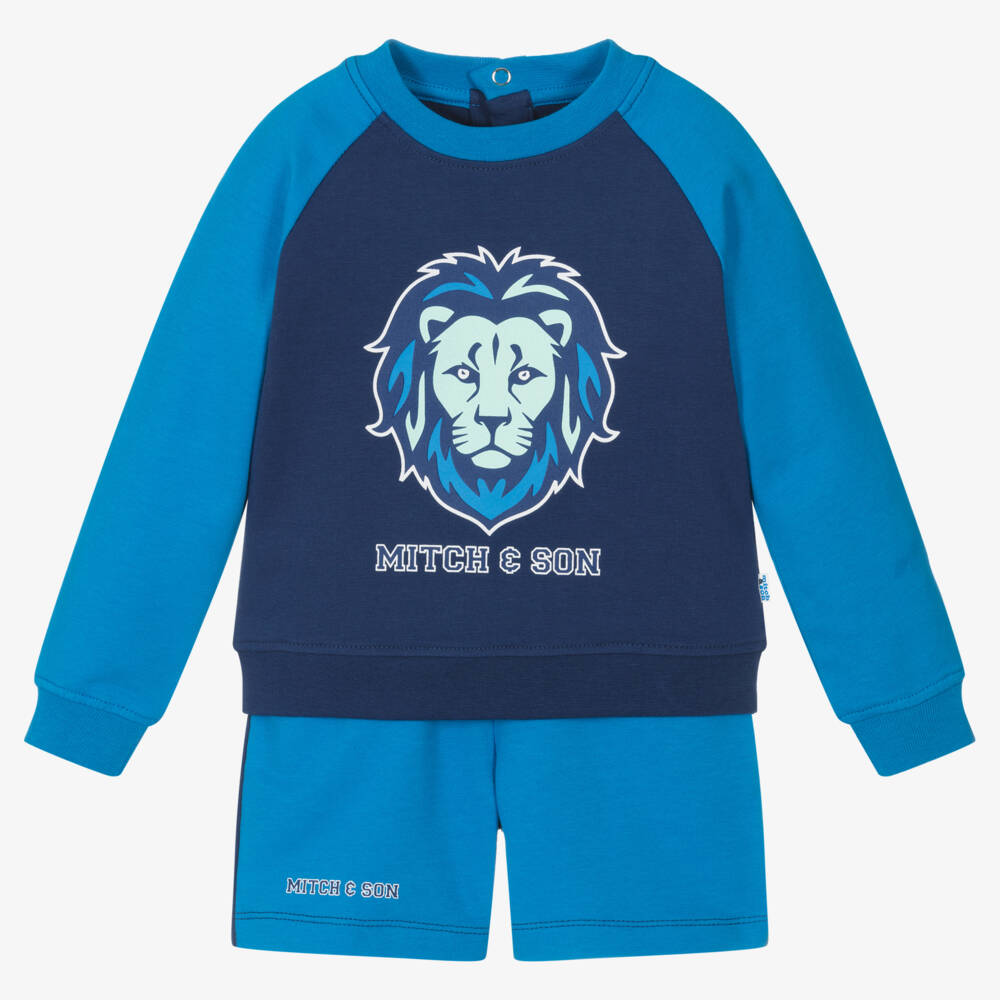 Blue shorts set for younger boys by Mitch & Son, made in soft, mid-weight cotton jersey. In two shades of blue, the sweatshirt top has raglan sleeves and a bold lion motif on the front for a casual, varsity feel. The matching shorts have front and back pockets and a comfortable drawstring waist. There is a logo print on the lower leg and a small white branded tab on the back pocket.