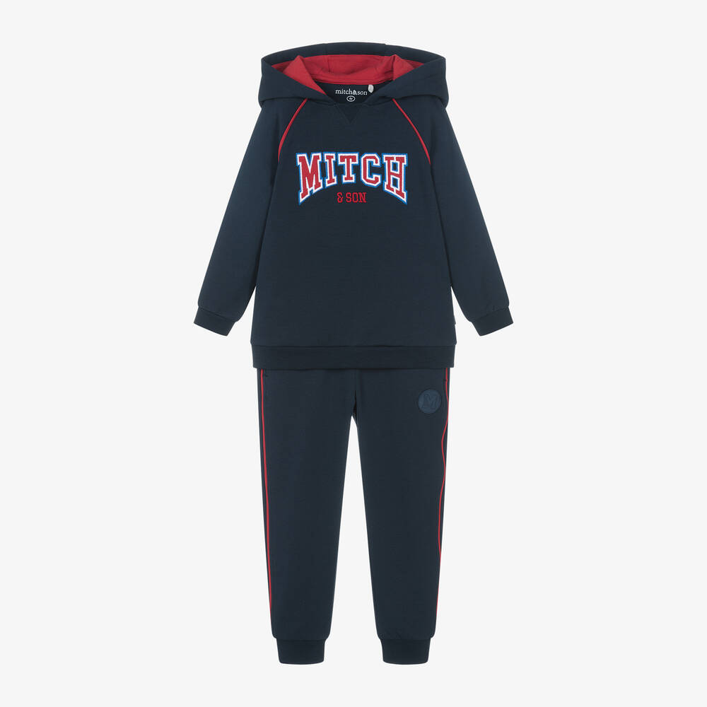 Navy blue tracksuit for boys by Mitch & Son, inspired by a sporty, collegiate vibe. Made in soft cotton jersey for relaxed wear, the hoodie has a varsity logo embroidered on the front and red piping. The coordinating cuffed joggers are designed with a stretchy drawstring waist and complete the casual look.