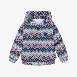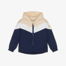 Navy blue and ivory varsity jacket for boys by Mitch & Son, felted for a soft, warm feel. It features a large yellow bouclé 'M' logo patch on the chest, with further branding on one sleeve and a large logo appliqué on the back. It has useful front pockets, striped, ribbed trims for extra cosiness and popper fastenings.