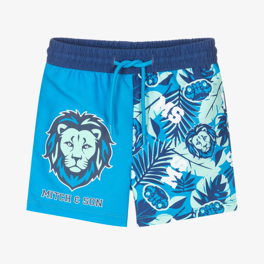 Blue swim shorts for younger boys by Scottish brand Mitch & Son. Made in soft and silky fabric, they have a comfortable drawstring waist for a secure and supportive fit. An asymmetrical piece, one leg is patterned in an all-over varsity jungle print and the other has a bold lion head motif on the front. They are lined in soft mesh for added comfort and protection.