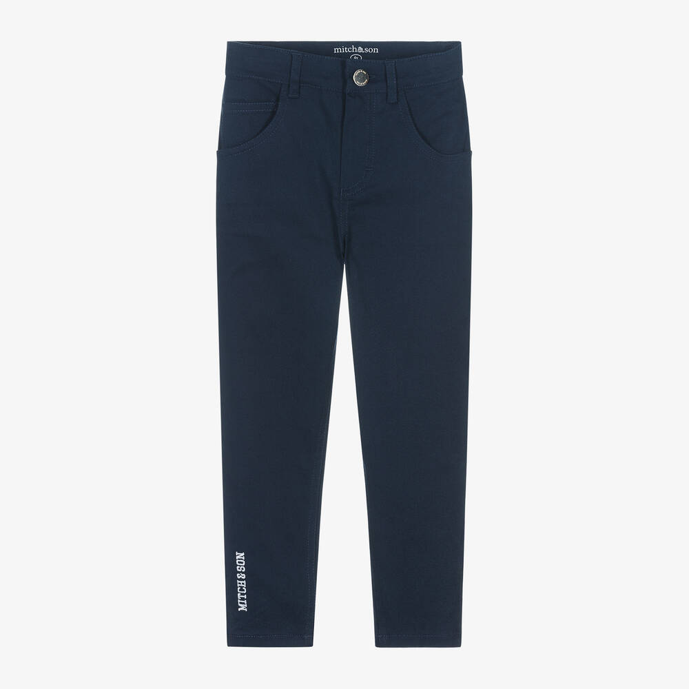 Smart navy blue trousers for boys by Mitch & Son, made in soft cotton twill with comfortable stretch. Slim-fitting, they have an embroidered logo on one leg and a rubberised logo patch on one of the back pockets. Designed with an adjustable waist for a great fit, they fasten with a simple button and zip on the front.