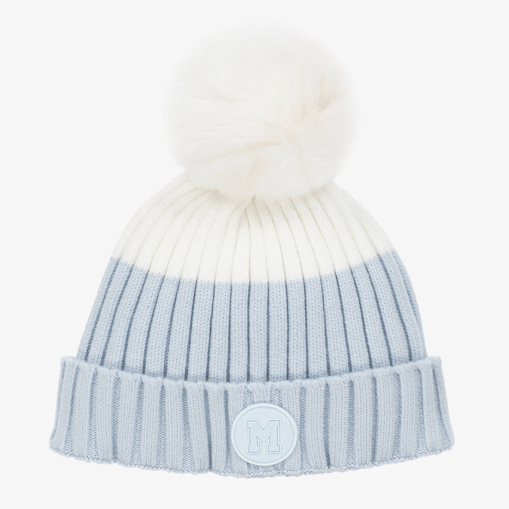 Cosy and comfortable for little boys, this blue and white bobble hat is by Mitch & Son. Knitted in a soft chunky rib, it has a gorgeous faux fur pom-pom on top, with a tonal rubberised logo patch on the turned up brim.