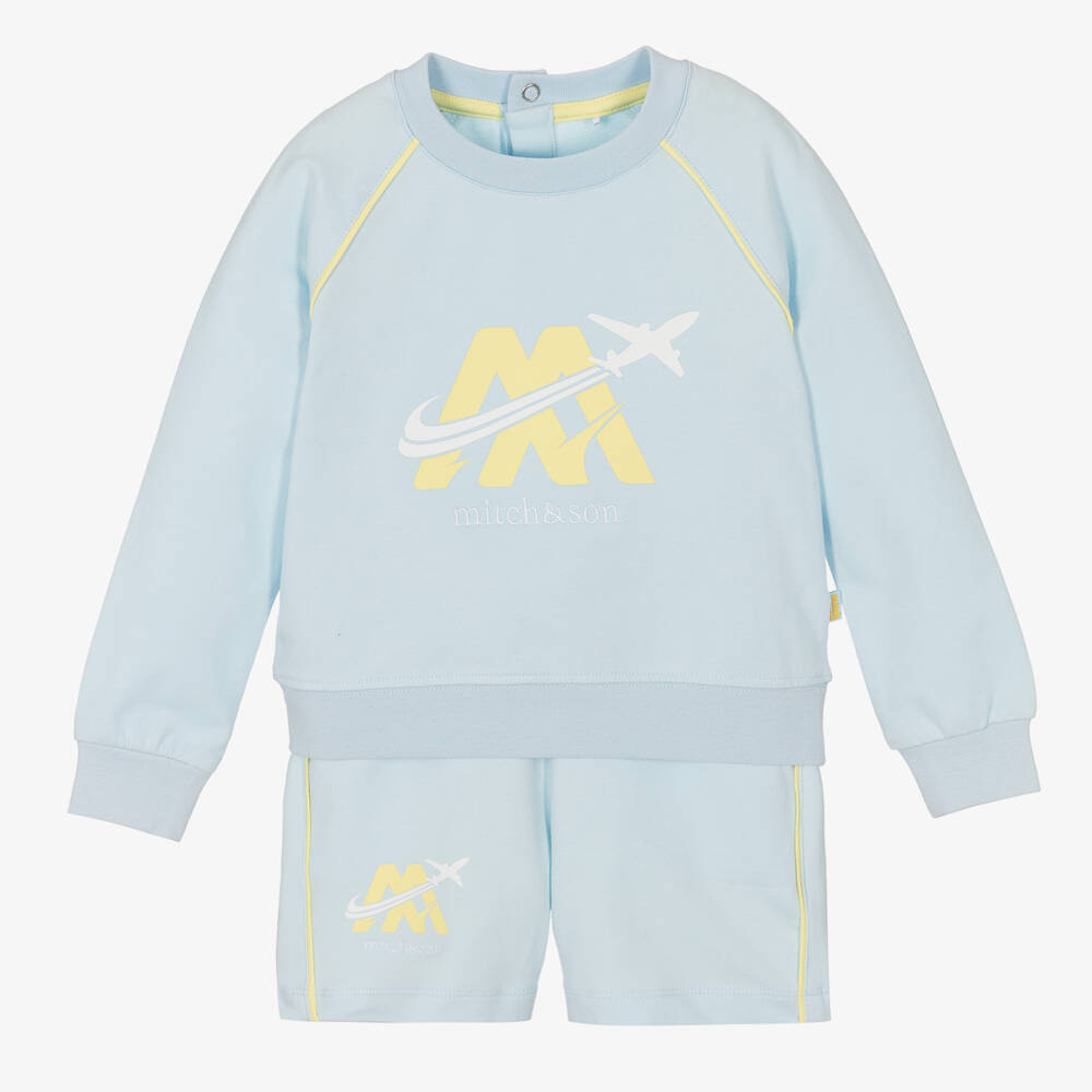 Pale blue tracksuit shorts set for younger boys, by Mitch & Son. Made in comfortable lightweight sweatshirt jersey, the top has a sporty yellow logo print on the front, with logo embroideries and yellow piped trims. Smaller sizes fasten with poppers on the back for easy dressing. It pairs with matching blue drawstring shorts to complete the relaxed look.