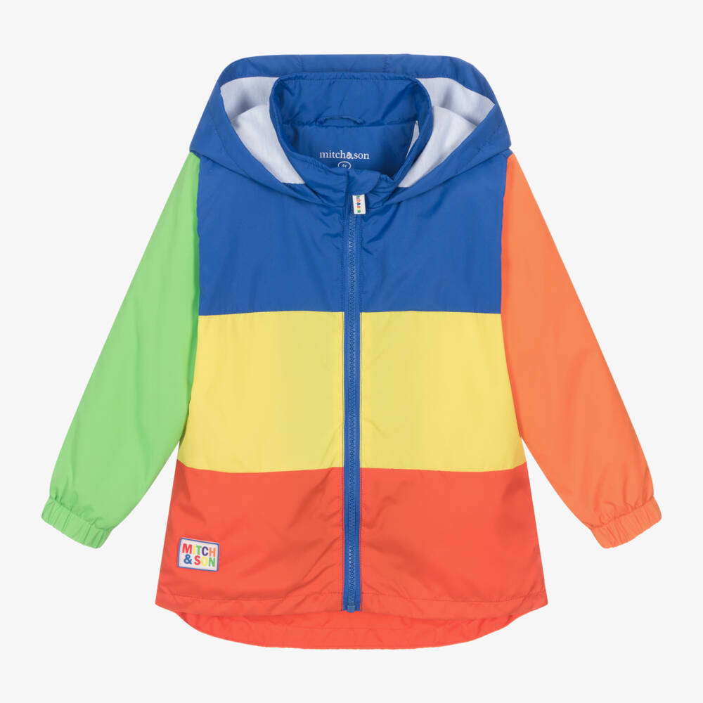 A vibrant colourblock windbreaker for boys by Scottish brand Mitch & Son. Made in silky smooth fabric, this lightweight jacket has a comfortable cotton jersey lining and an exposed front zip with a rubberised branded puller. There are elasticated cuffs to help keep out chilly winds, and concealed side seam pockets. A rubberised logo patch on the front adds a finishing designer touch.