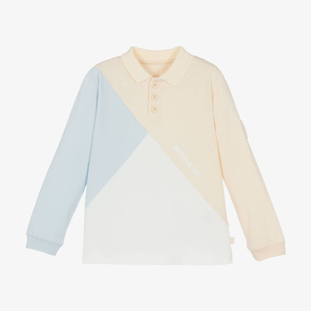 Colourblock long-sleeved polo shirt for boys by Mitch & Son. Made in soft and stretchy cotton jersey, it has panels in dark ivory, blue and white. Classically styled with a knitted collar and ribbed cuffs, it has branded button fasteings on the front. For a statement designer finish, it has a white logo printed on the front and a tonal ivory appliqué logo patch on one sleeve.