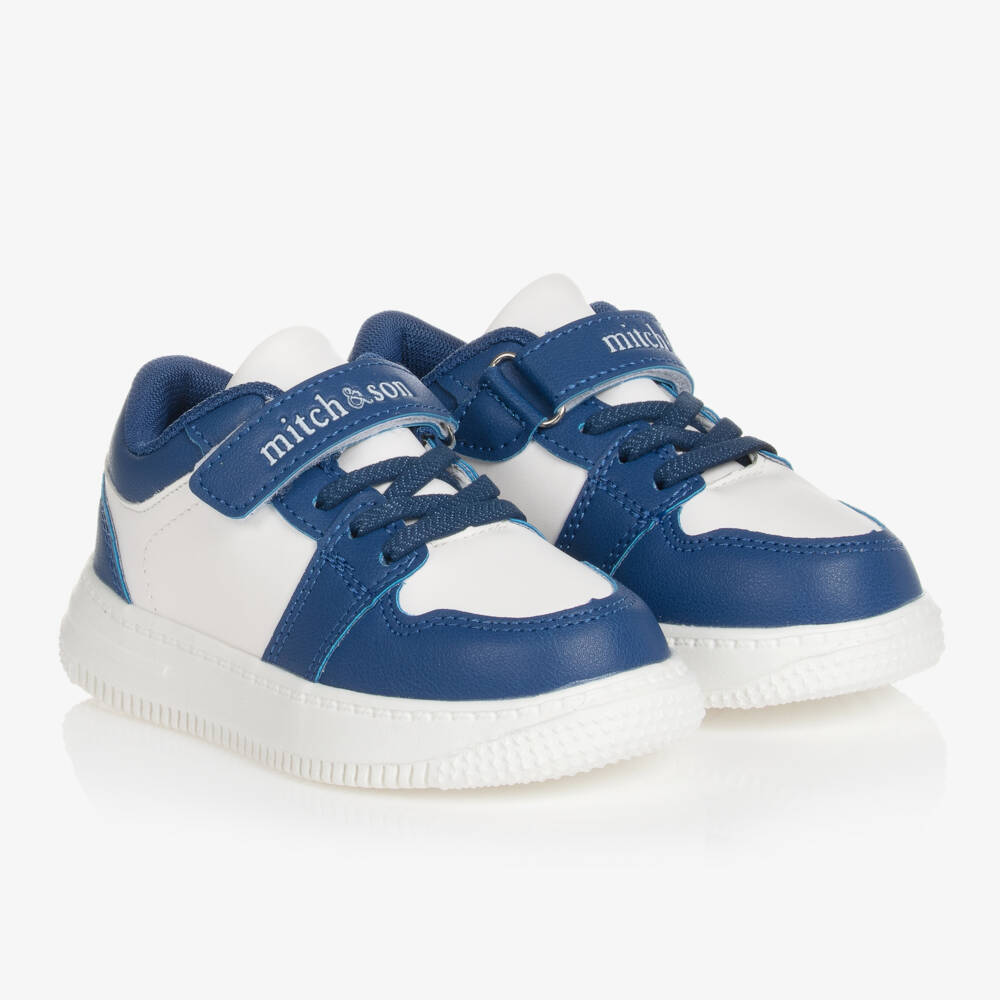 Dark blue and white faux leather trainers for boys by Mitch & Son. Fastening with a velcro strap across the foot and fixed, stretchy, elasticated laces, they have a blue mesh fabric lining and a comfortable, cushioned insole. The non-slip, white rubber outsole offers a good grip on slippery surfaces.