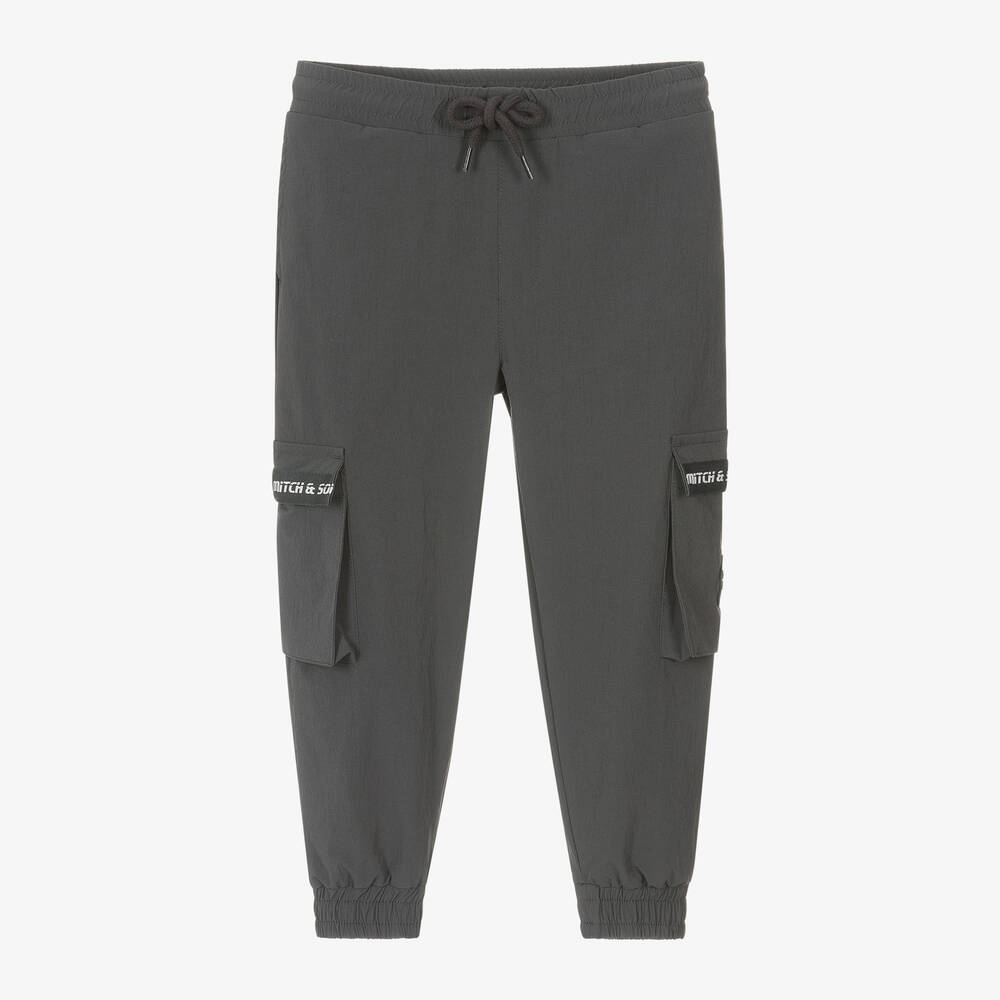 Cool dark grey cargo-style joggers for boys by Mitch & Son. They are made in lightweight yet durable fabric with stretch, and lined in soft cotton jersey for comfort and added flexibility. The utility-style design includes velcro fastening cargo pockets with logo taped trims and a logo patch on one. They have elasticated cuffs and a functional drawstring on the waist.