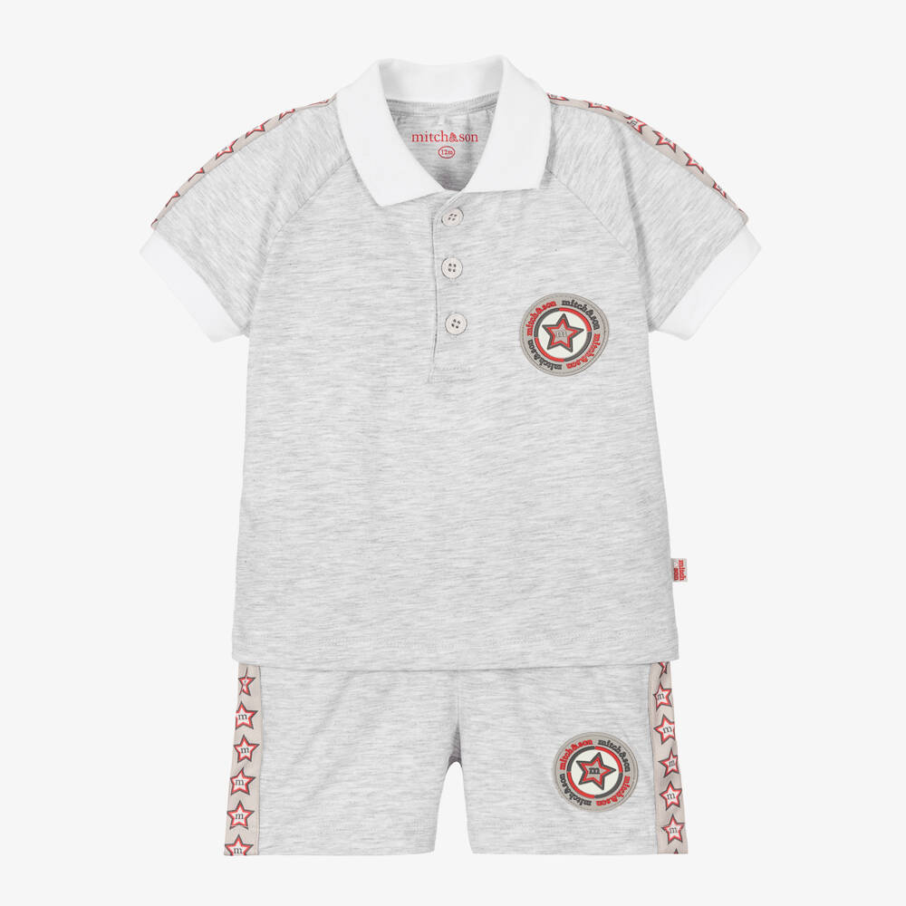 Casual grey marl shorts set for boys, by Mitch & Son. Made in soft cotton jersey, the polo shirt has white ribbed trims and a rubberised logo badge on the front. It comes with matching drawstring shorts with sporty logo taping on the sides to complete the laidback look.