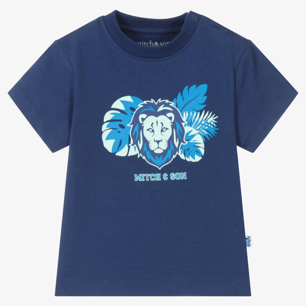 Navy blue T-shirt for younger boys by Scottish brand Mitch & Son, made from soft cotton jersey. Cool and casual, it has a varsity jungle print on the front featuring a bold lion's head and tropical leaves. Smaller sizes have popper fastenings on one shoulder to help with daily dressing.