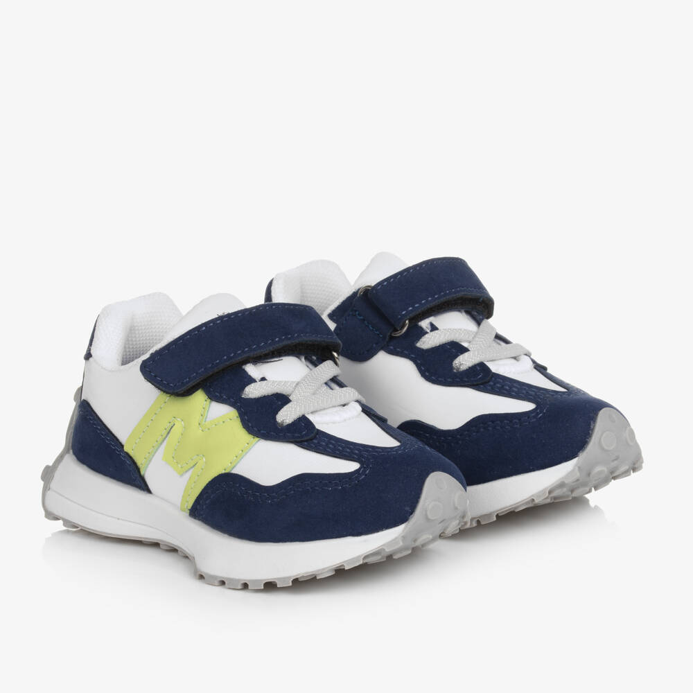 Casual white and navy blue trainers for boys by Mitch & Son, made from textile with faux suede trims. Great for pairing with their sporty outfit, these sneakers have the brand's 'M' motif on the side in bright green faux leather. They have a velcro strap, elasticated laces and a lightly padded textile insole for comfort and convenience. The flexible rubber outsole has a deep tread that extends to the ankle.