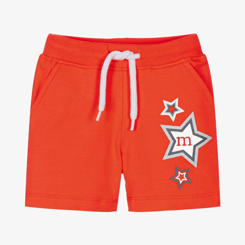 Casual red cotton shorts for boys, by Scottish brand Mitch & Son. Printed with fun star graphics on the front, they have a comfortable drawstring waist and an 'M' logo embroidery on one leg for a logo-inspired finish.
