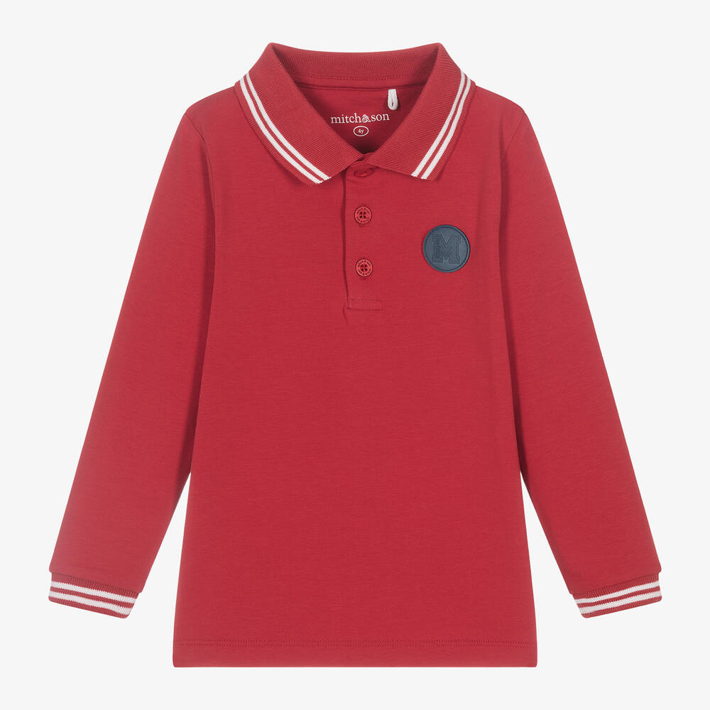 Red polo shirt for boys by Mitch & Son, made in soft cotton jersey. This long-sleeved style has a navy blue rubberised logo badge on the chest. For added sporty inspiration, it has a ribbed collar with white stripes and matching striped cuffs. Simple button fastenings complete the look.