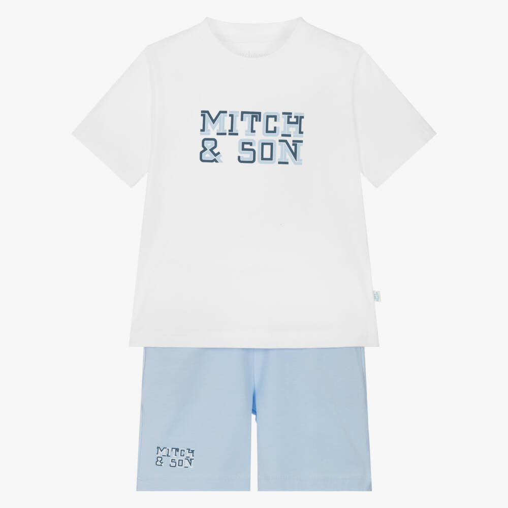 In white and pale blue, this casual shorts set for boys is by Mitch & Son. Both pieces are made in soft cotton jersey, with matching logo prints on the front. The shorts have four pockets and a comfortable elasticated waist with a drawstring fastening.