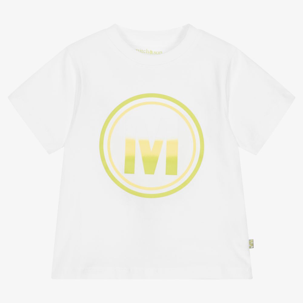 White T-shirt for boys by Mitch & Son, made in soft cotton jersey. The front has a round logo print in lime green, yellow and white.