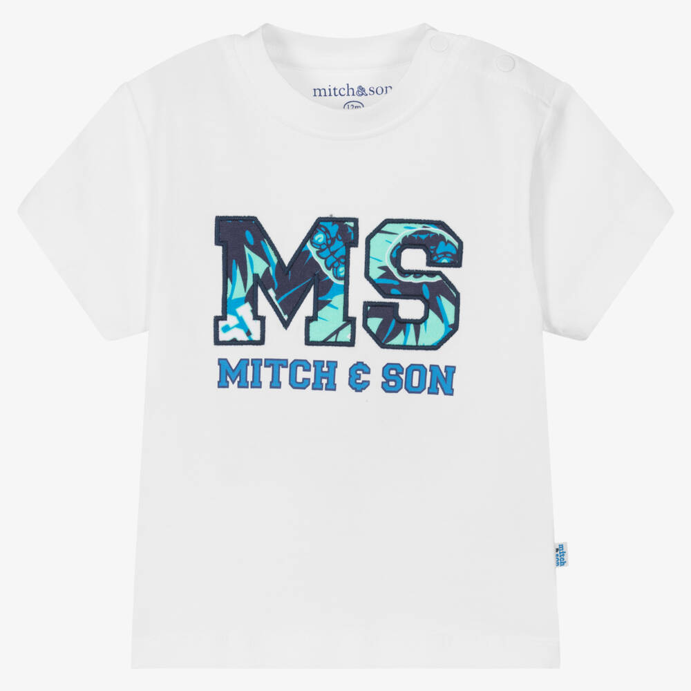White T-shirt for younger boys by Scottish brand Mitch & Son, made in soft cotton jersey. Cool and casual, it has a classic crew neck and popper fastenings on one shoulder for easy dressing. There is a blue and green varsity jungle logo print on the front and a rubberised logo tab on the side seam.