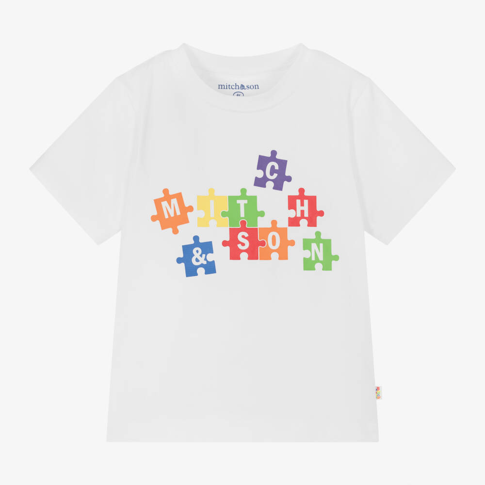 Bright white T-shirt for younger boys by Mitch & Son, made in soft and stretchy cotton jersey. Ideal for casual days, this short-sleeved top has a colourful puzzle print on the front with logo lettering. It has a lightly ribbed crew neck and a rubberised logo tab on the side seam. Smaller sizes have popper fastenings on the shoulder for easy dressing.