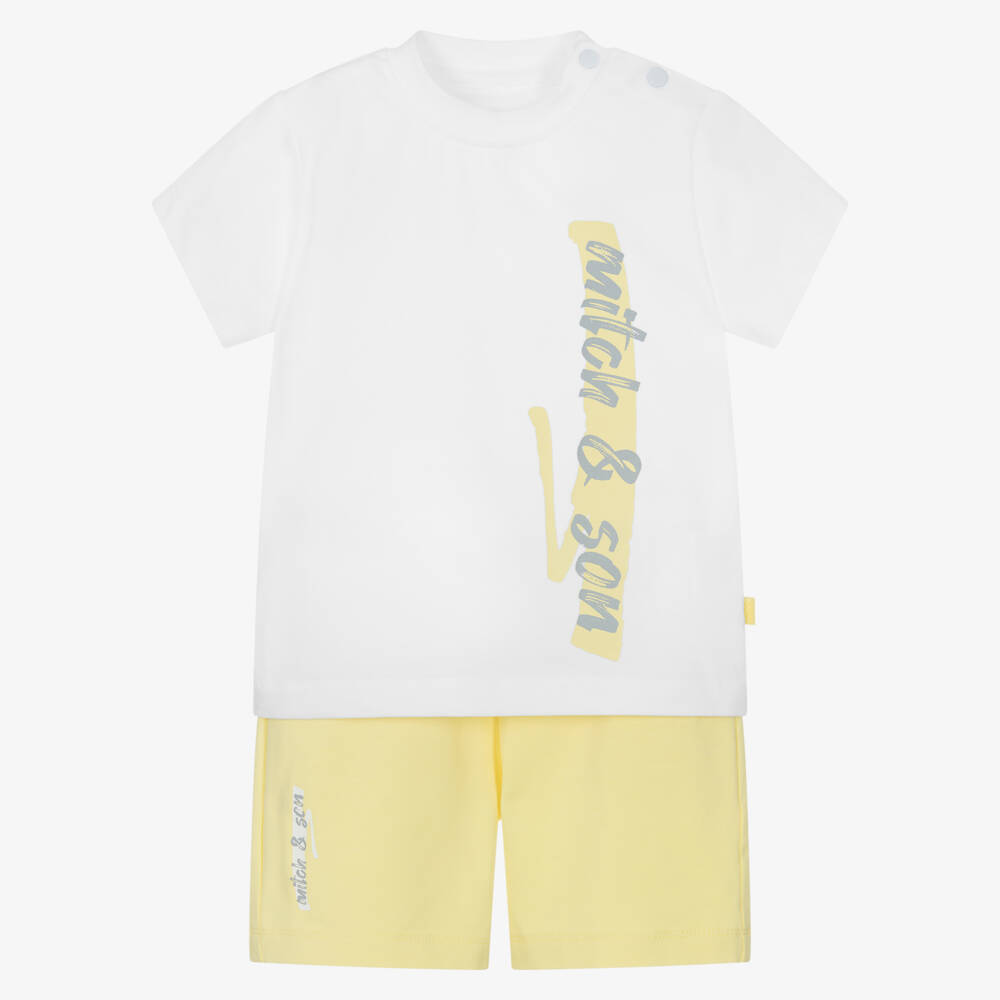 A white T-shirt and pastel yellow shorts set for younger boys by Mitch & Son, with coordinating vertical logo prints. Both the pieces are made in soft cotton jersey for casual comfort with a drawstring waist and four pockets on the shorts. Smaller sizes have shoulder popper fastenings on the T-shirt.