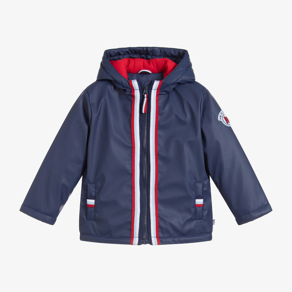 Navy blue hooded rain jacket for boys by Mitch & Son. Showerproof, it is made in smooth, coated polyester, is softly padded and lined in warm red fleece. It has red, blue and white striped trims with a pale blue and red fabric logo appliqué on one sleeve.