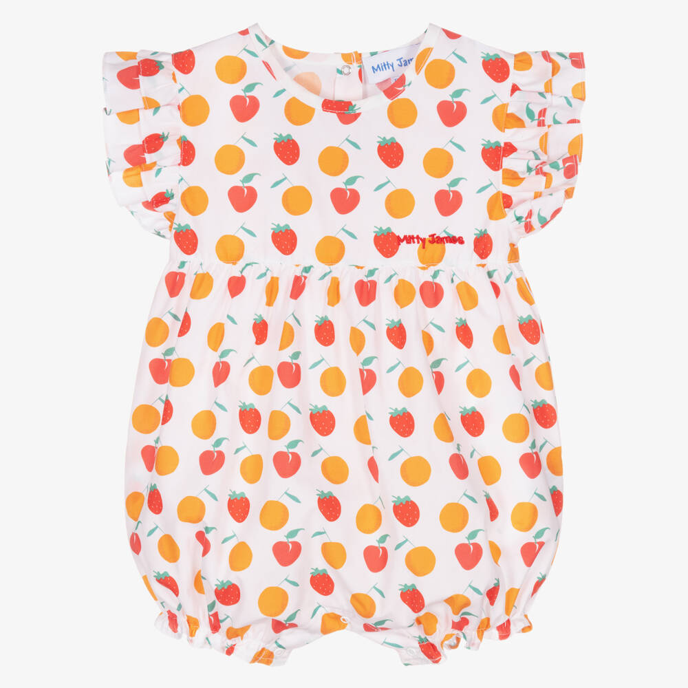 Exclusive to Childrensalon, a pretty white cotton shortie for baby girls by Mitty James, made in soft poplin. With a cute red and orange fruit print, it has red logo embroidery on the front and ruffles over the shoulders. It fastens with poppers on the back and between the legs.