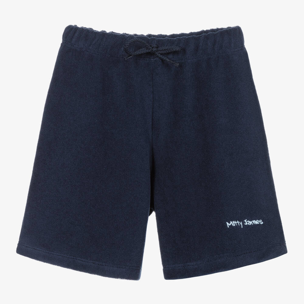 Navy blue shorts for boys and girls by Mitty James, exclusive to Childrensalon and just right for the beach or poolside. They are made in soft, absorbent cotton towelling with a smooth reverse side and have a comfortable elasticated waistband with a faux drawstring tie. There is pale blue logo embroidery on one leg.