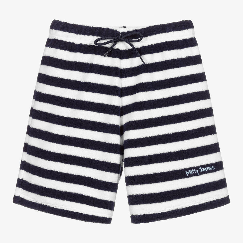 Navy blue and white striped beach shorts for boys and girls by Mitty James, exclusive to Childrensalon and just right for the beach or poolside. They are made in soft, absorbent cotton towelling with a smooth reverse side and have a comfortable elasticated waistband with a faux drawstring tie. There is pale blue logo embroidery on one leg.