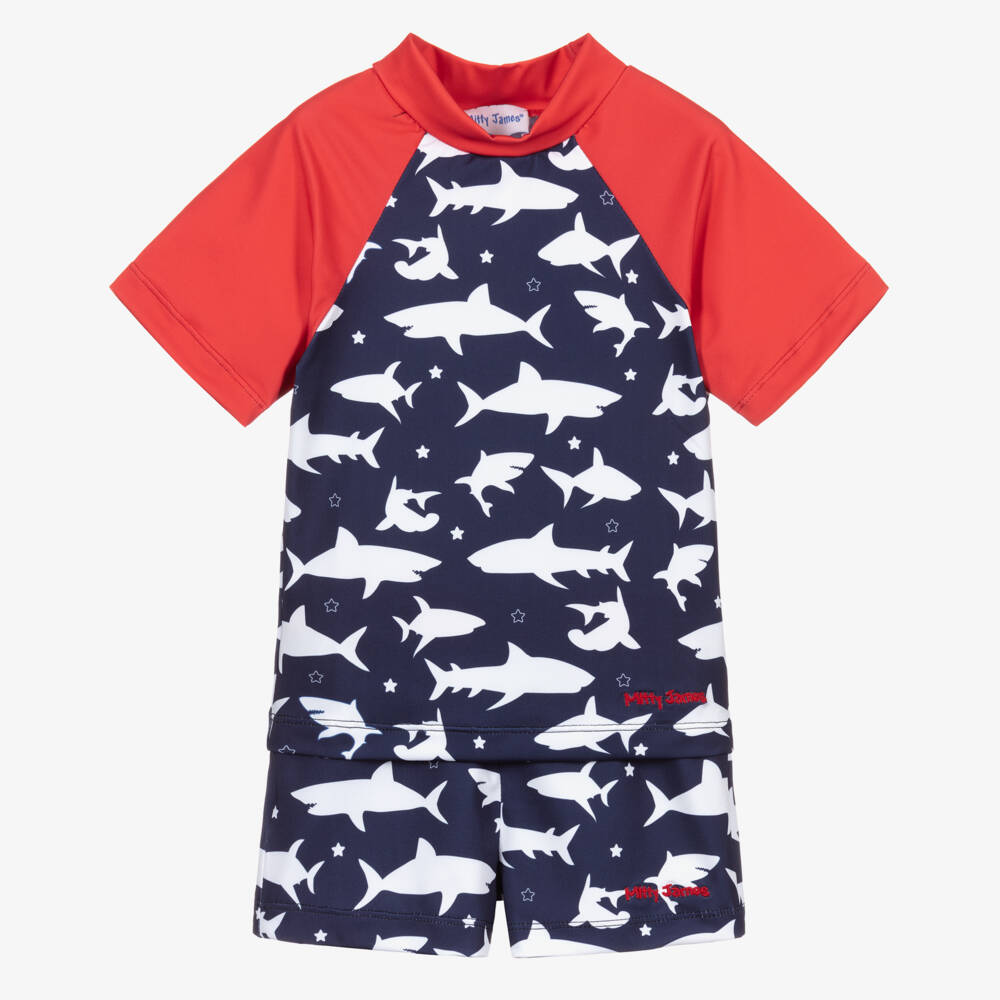 Exclusive to Childrensalon, a navy blue swim top and shorts set for boys by Mitty James. Made in silky smooth and stretchy UPF 50+ fabric, it has a cute white shark print and red trims. Both pieces have the brand's logo embroidered in red on the front.