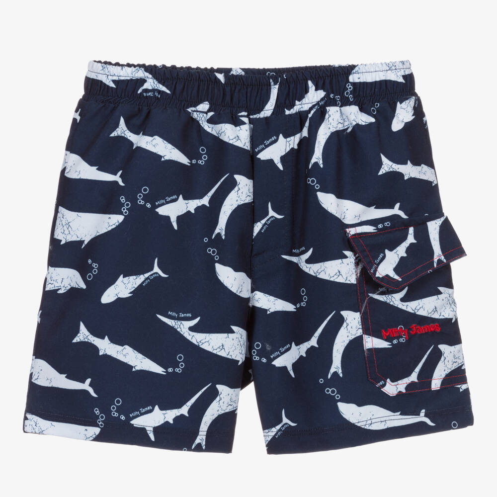 Exclusive to Childrensalon, a pair of navy blue UPF 50+ swim shorts for boys by Mitty James, patterned with white sharks. Soft and lightweight, they have a jersey lining for comfort and the brand's logo embroidered in red on the side flap pocket.