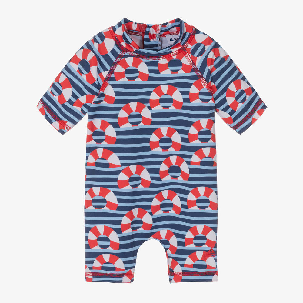 Fun sun suit for boys by Mitty James, exclusive to Childrensalon. Made in silky smooth and stretchy UPF50+ fabric, it is striped in shades of blue and patterned in red and white swim rings, with red over-stitch detailing. The exposed red zip fastening on the back has a useful, protective zip guard.