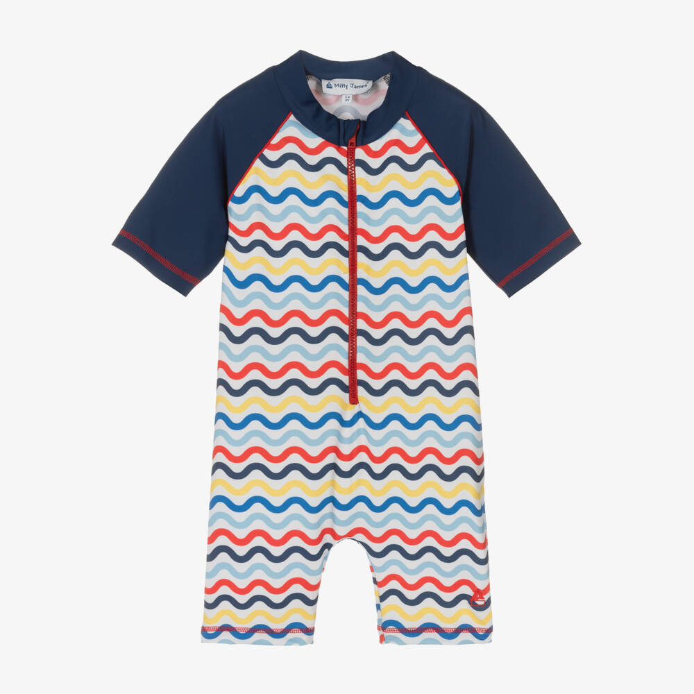 Eye-catching sun suit for boys by Mitty James, exclusive to Childrensalon, ideal for the beach or pool. Soft and silky with UPF 50+, it has colourful, wavy stripes on a white background, with a navy blue collar and raglan sleeves. The sun suit has red piped detailing with matching overstitching and an exposed red zip fastening on the front with a useful, protective chin guard.