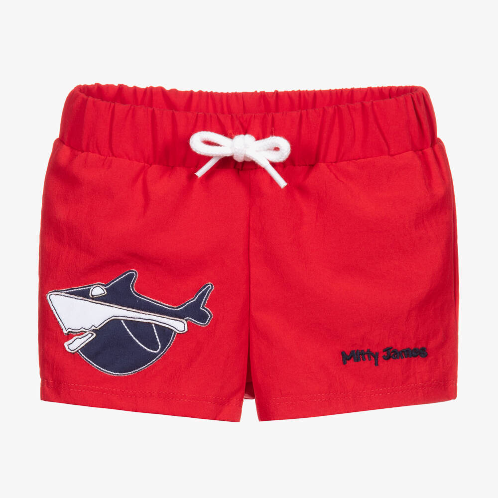 Exclusive to Childrensalon, a pair of red swim shorts for boys by Mitty James, with a cute white and navy blue shark appliqué on the front. Soft and lightweight, they are made in UPF 50+ fabric, with a jersey lining for comfort, and the brand's logo embroidered in navy blue on the front. There is a faux drawstring tie on the elasticated waistband.