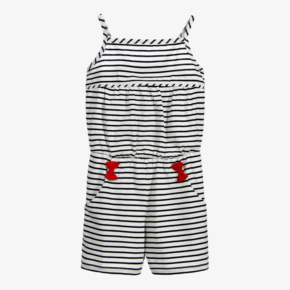 Exclusive to Childrensalon, a white and navy blue striped cotton playsuit for girls by Mitty James, with red bow trims. Made in soft, comfortable jersey, it has an elasticated waistband and useful side pockets. Easy to wear, it just pulls up.