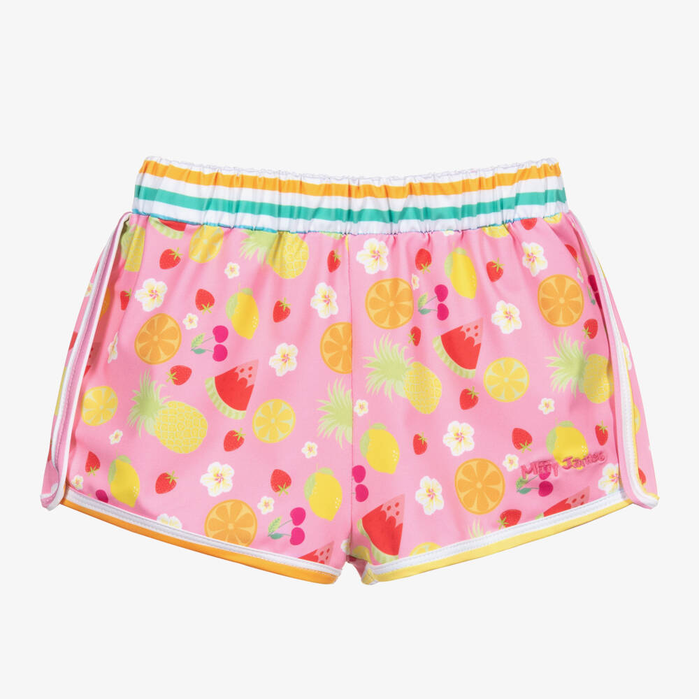 Exclusive to Childrensalon, pink swim shorts for girls from Mitty James, with a cute fruits and flowers print in red and yellow. Ideal for the beach or poolside, they are made in silky smooth, stretchy UPF 50+ fabric, with a comfortable, elasticated waistband striped in white, yellow and green. The brand's pink logo is embroidered on one side.