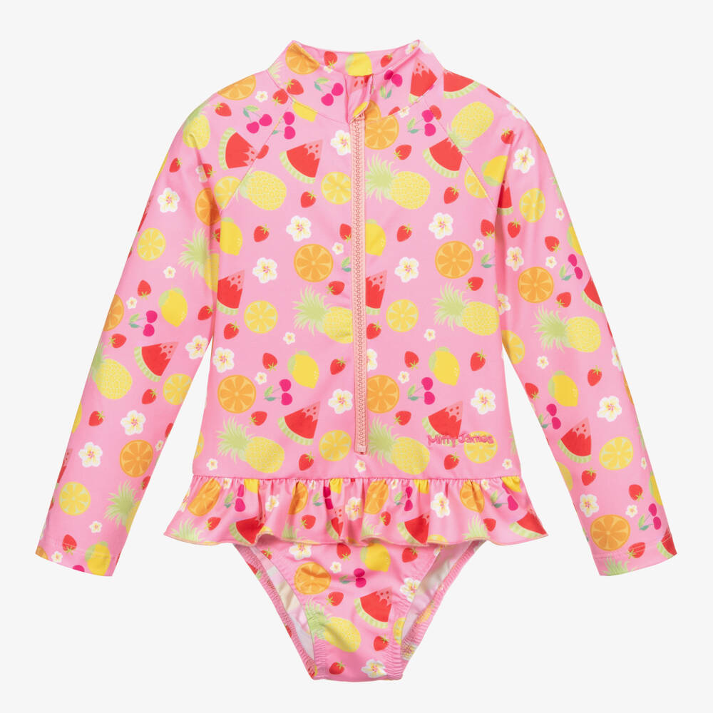 Exclusive to Childrensalon, a pink swimsuit for girls by Mitty James, with a cute fruits and flowers print in red and yellow. Ideal for the beach or poolside, it is made in silky smooth and stretchy UPF 50+ fabric with long sleeves and has an easy-to-use front zip fastening with a protective chin guard. There are pretty ruffles around the hips with a pink logo embroidered above.
