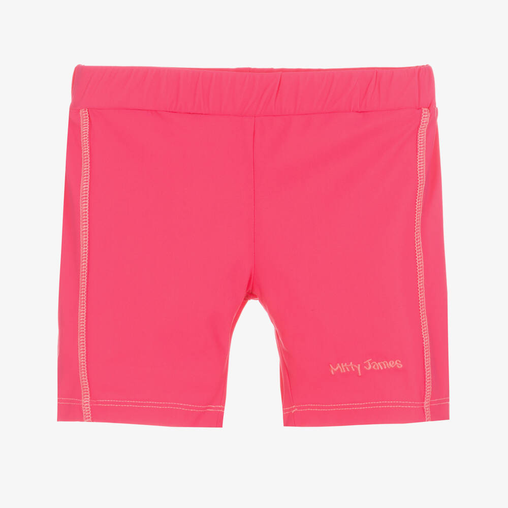 Exclusive to Childrensalon, stretchy pink swim shorts for girls by Mitty James, ideal for the beach or poolside. Silky smooth with UPF 50+, they have overstitch detailing, pink logo embroidery on one leg and a comfortable, elasticated waistband.
