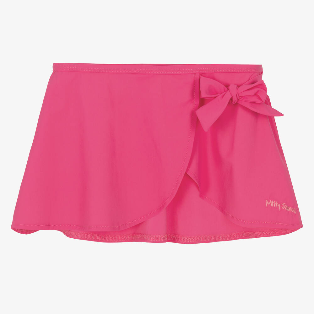 Exclusive to Childrensalon, this pink cover-up swim skirt for girls is by Mitty James, ideal for wearing over a swimming costume or bikini bottoms for additional cover at the beach or by the pool. Made in silky smooth and stretchy UPF 50+ fabric, it has a fixed bow and embroidered pink logo on one side. Easy to wear, it has an elasticated waist and simply pulls up.