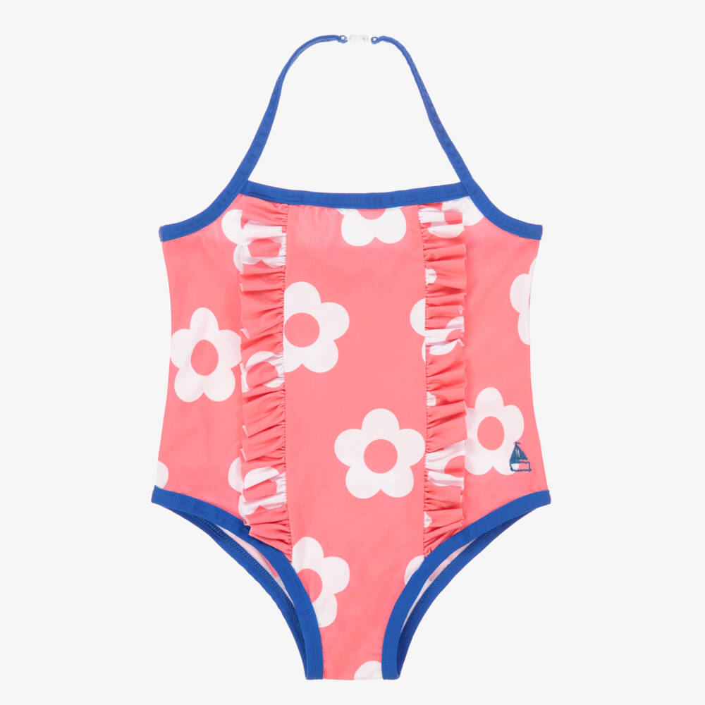 Pretty pink swimsuit for girls by Mitty James, exclusive to Childrensalon and patterned with white flowers. Just right for days by the pool or beach, it is made in silky smooth and stretchy UPF 50+ fabric, with an adjustable halter neck strap for a good fit. There are feminine ruffles on the central panel, Royal blue trims and the brand's embroidered boat logo on one side.