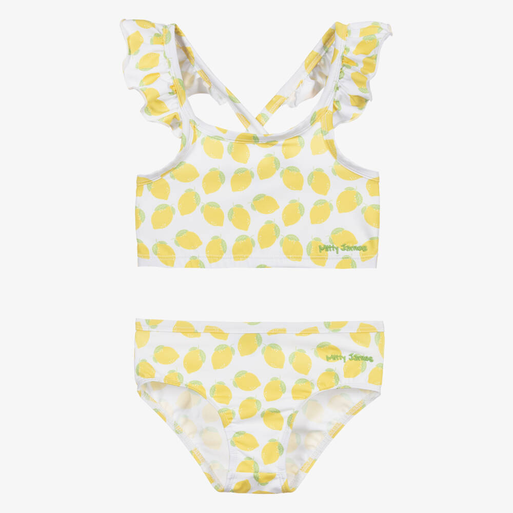Exclusive to Childrensalon, a white tankini for girls by Mitty James, with a cute yellow lemon print. Made in silky smooth and stretchy UPF 50+ fabric, the top has sweet cross-over ruffle straps and comes with matching bottoms. Both pieces have the brand's logo embroidered in green on the front.
