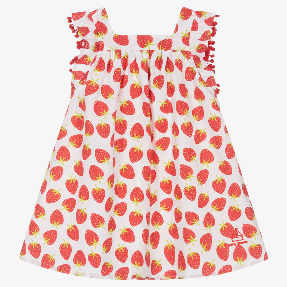 Exclusive to Childrensalon, a sweet white dress for girls by Mitty James, with a red strawberry print. To be worn as a casual dress or as beachwear, it is made in comfortable cotton poplin and is full and gathered from the neckline. There are pretty red bobble trims on the ruffles over the shoulders and button fastenings around the back. The brand's logo is embroidered in red by the hemline.