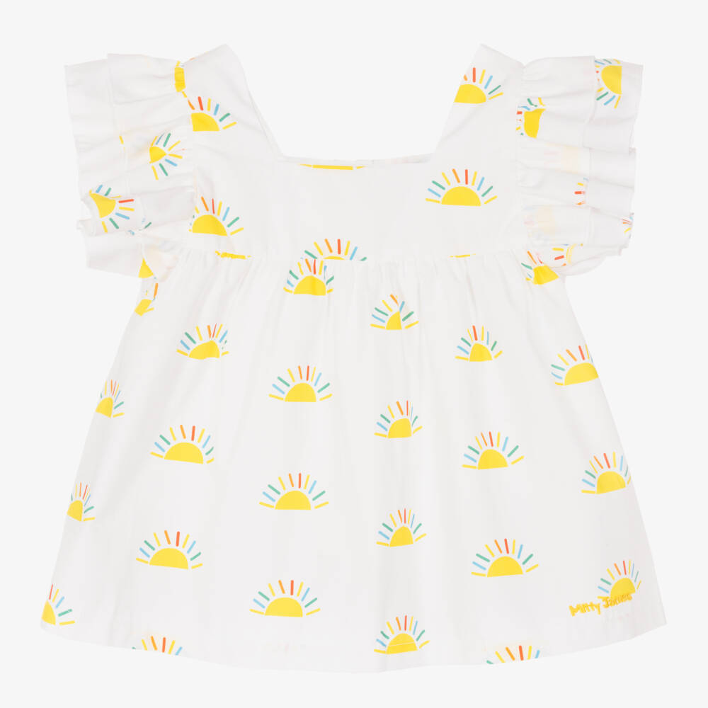 Exclusive to Childrensalon, a lovely white blouse for girls by Mitty James, with a yellow sunshine print. Made in soft, comfortable cotton poplin, it has pretty, tiered, ruffled sleeves and fastens with buttons around the back.