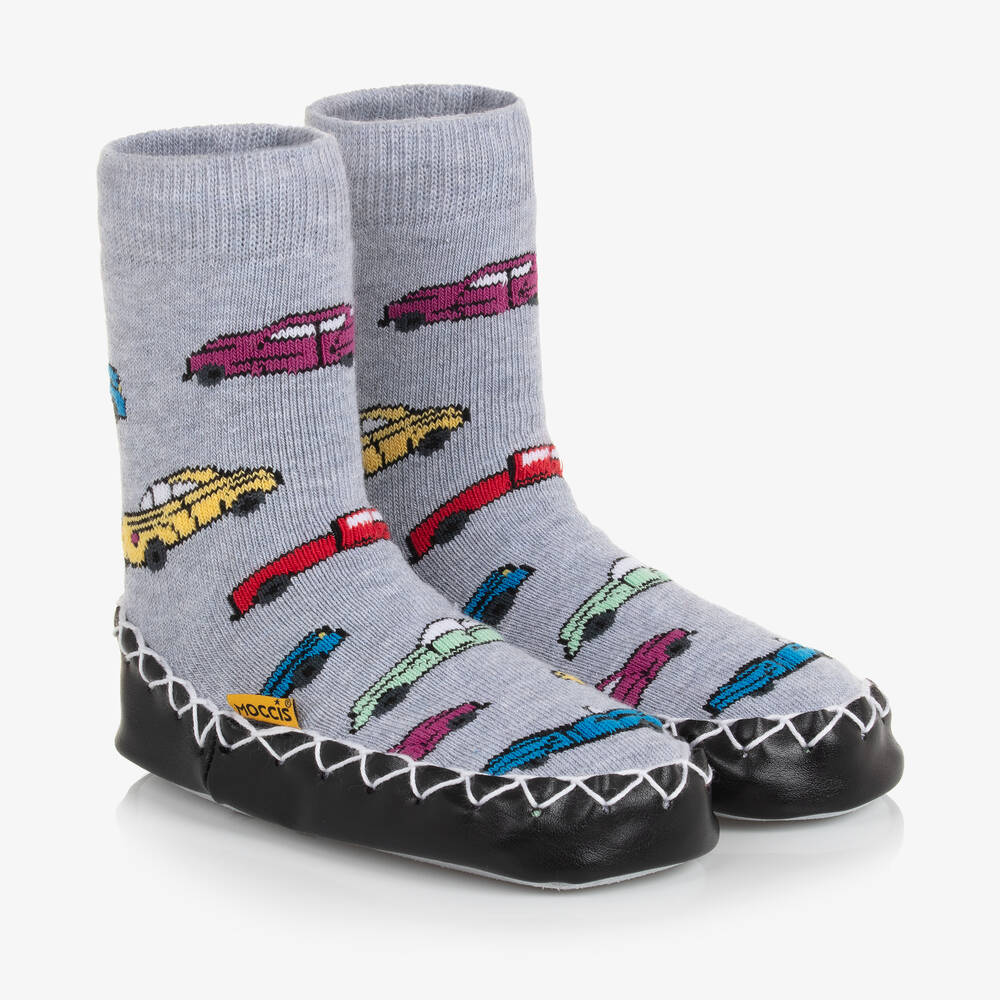 Grey slipper socks with a fun car print for boys and girls by Moccis. Made from natural Oeko-Tex® certified cotton blend fabrics, the leather sole is durable and flexible, allowing children's feet to move freely and muscles to develop. For little crawlers, or older walkers, these indoor shoes have skid proof slipper soles, and double elastic around the ankles.