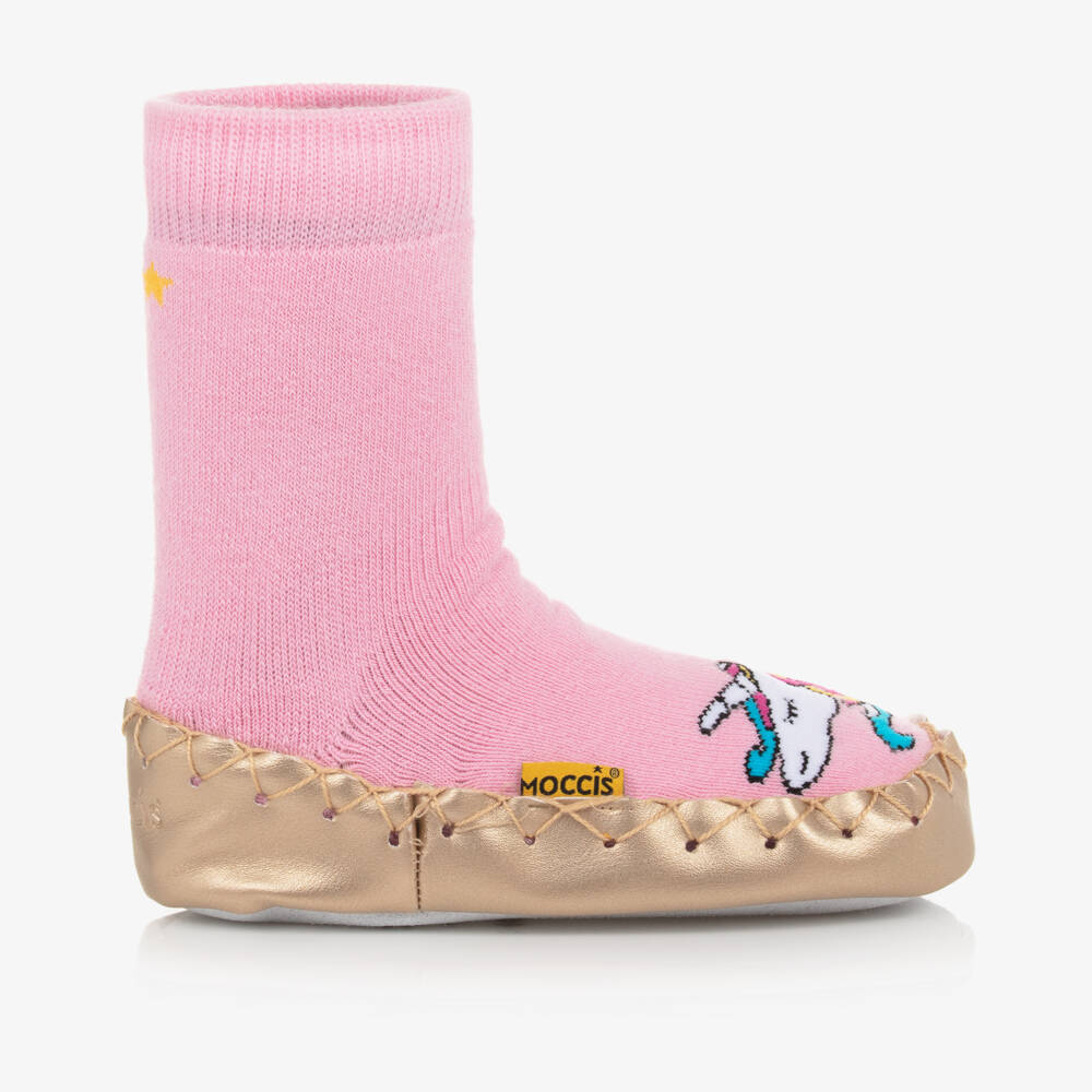 Pink and gold unicorn Moccis for girls, made from Oeko-Tex® fabrics. The durable and flexible leather sole, allows the feet to move freely and the invisible elastic around the ankles of the stretchy sock helps prevent them from falling off. They make the ideal non-slip indoor shoe or slipper.