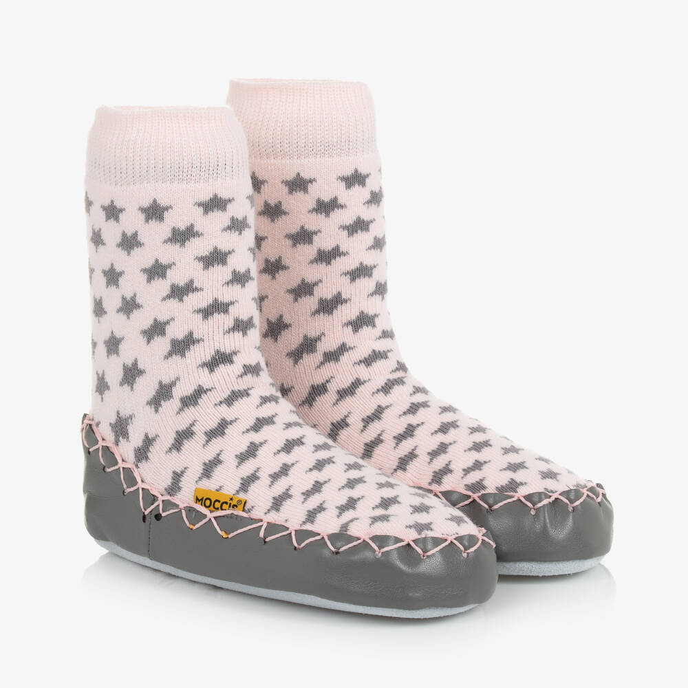 Pink and grey star slipper socks for girls by Moccis. Made from natural Oeko-Tex® certified fabrics, they have finishing touches sewn by hand. The leather sole is durable and flexible, allowing children's feet to move freely and muscles to develop. For little crawlers, or older walkers, these indoor shoes have skid proof slipper soles, and double elastic around the ankles.