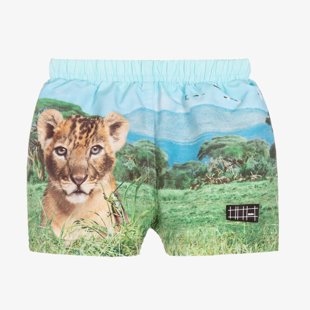 Blue and green swimming shorts for little boys by Molo, printed with scenery, a beige lion cub and a grasshopper. The silky smooth fabric has a UPF50+ rating and is made from recycled polyester. They have a black and white rubber logo patch on one leg, stretchy integrated pants lining for comfort and an elasticated waist for easy pull-on.