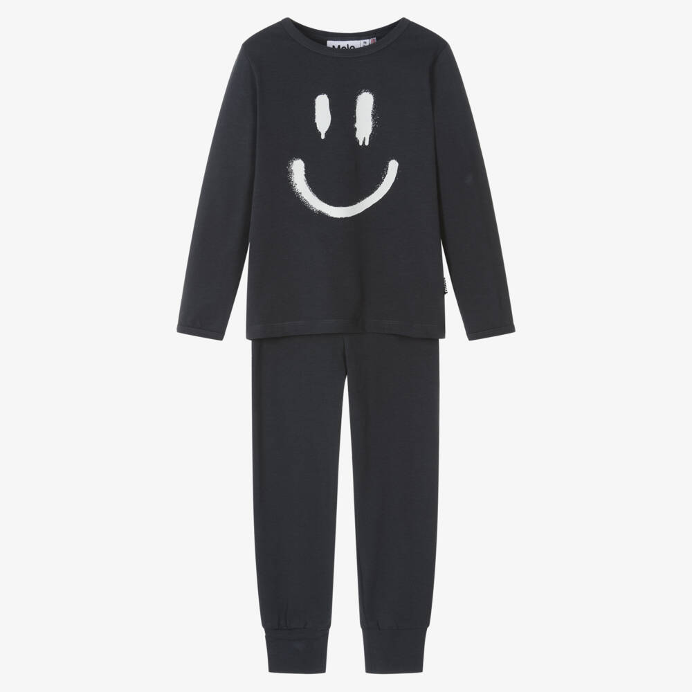 Charcoal grey pyjamas for boys and girls by Danish brand Molo, made from super soft organic cotton jersey. The long sleeved top has a white graffiti-style smiling face print on the front and a logo tab on the side seam. The trousers are cuffed at the ankle and have a comfortable elasticated waist.