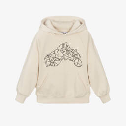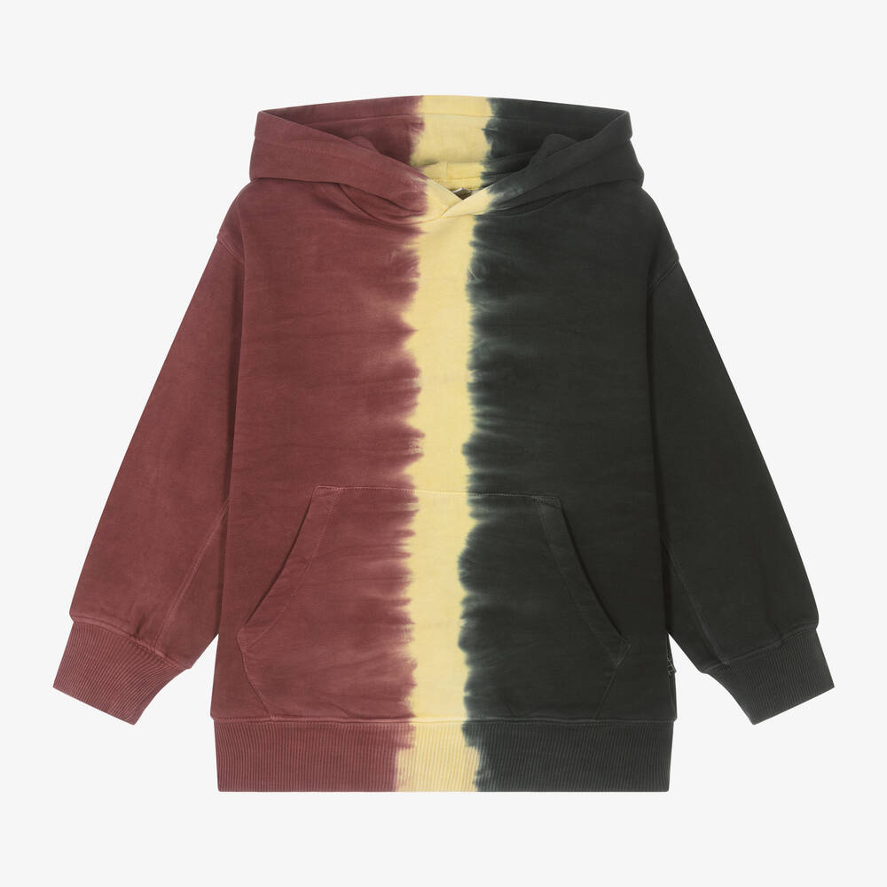 A cool hoodie for boys and girls by Molo, made in mid-weight organic jersey with a split tie-dye design. In shades of maroon red, yellow and black, this oversized, loose-fitting top has a hooded neckline and a roomy pouch pocket on the front. There are softly ribbed details on the cuffs and hem with added stretch.