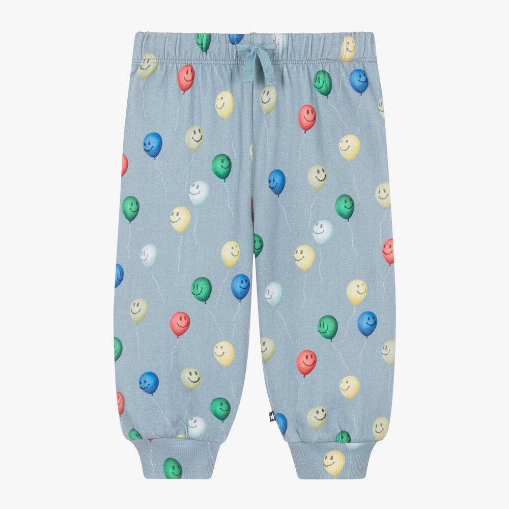 Pale blue joggers for little boys and girls by Danish brand Molo, patterned in colourful smiling balloons. Casual and comfortable, they are made in soft organic cotton jersey, with an elasticated drawstring waist. There are gently ribbed ankle cuffs, with a small logo tab on the side seam adding a subtle designer finish.