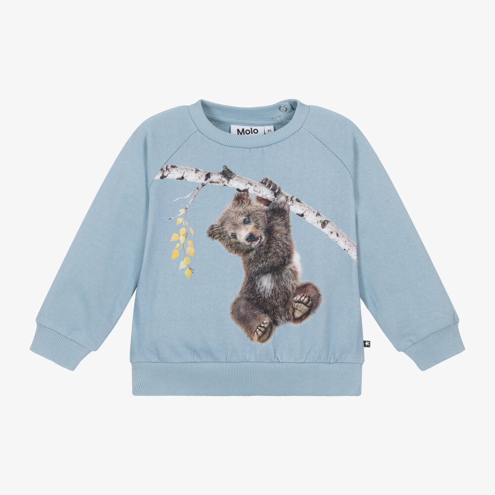 Pale blue sweatshirt for little boys and girls by Danish brand Molo, with an adorable brown bear cub on the front. Casual and comfortable, it is made in soft organic cotton jersey with ribbed trims. There are raglan sleeves for easy movement, fastening with poppers on the back to help with dressing. A small logo tab on the side seam adds a finishing designer touch.