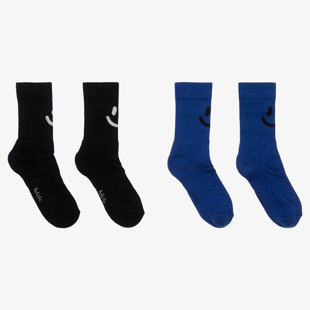 Two pairs of cosy ribbed socks for boys and girls by Molo. Made in a soft and stretchy cotton-rich blend, both have a cute smiling face intarsia motif on the front and a logo on the bottom of the foot. One pair is royal blue and black whilst the other pair is black and white.