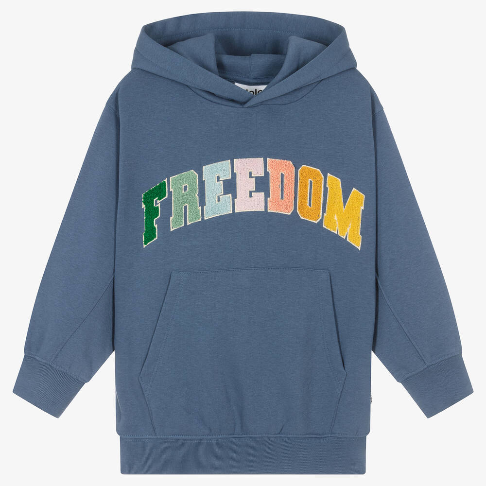 Casual and comfy for boys and girls, this blue cotton-blend hoodie is by Danish brand Molo. The word 'Freedom' is appliquéd in colourful letters on the front, with pouch pockets adding a sporty finish. Made in mid-weight jersey, it has a cosy fleecy inside and ribbed trims for a snug fit.
