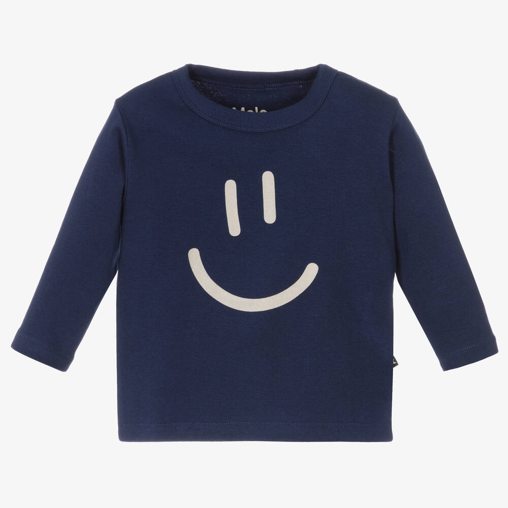 Little boys and girls deep blue top by Danish brand Molo, made in soft organic cotton jersey. A fun and playful top, it has a navy blue smiley face print on the front.